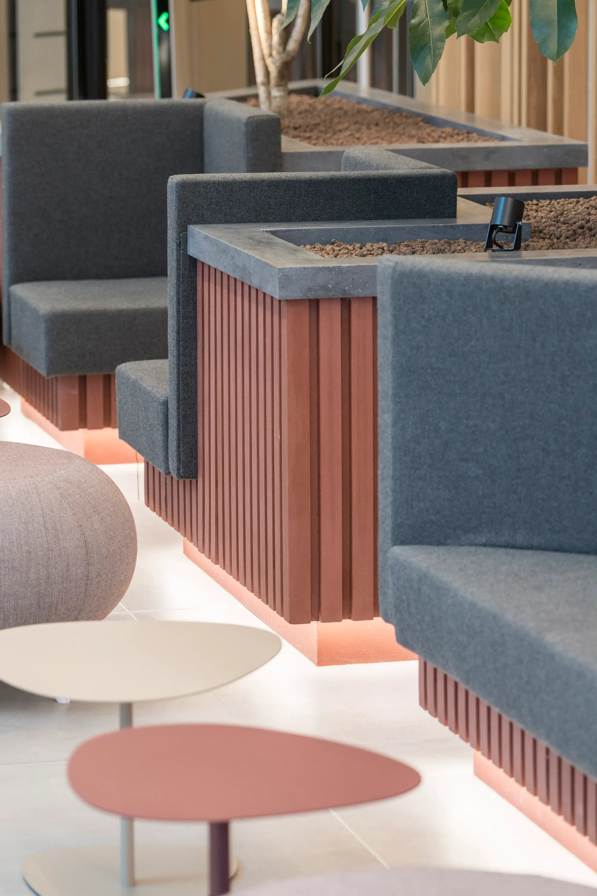 In this era of re-use, our design sustainably retains the original Portland stone cladding of the primary core and overlays a palette of warm timber, natural-based fabrics and earthy-red concretes - a radical change from the previous fit-out.