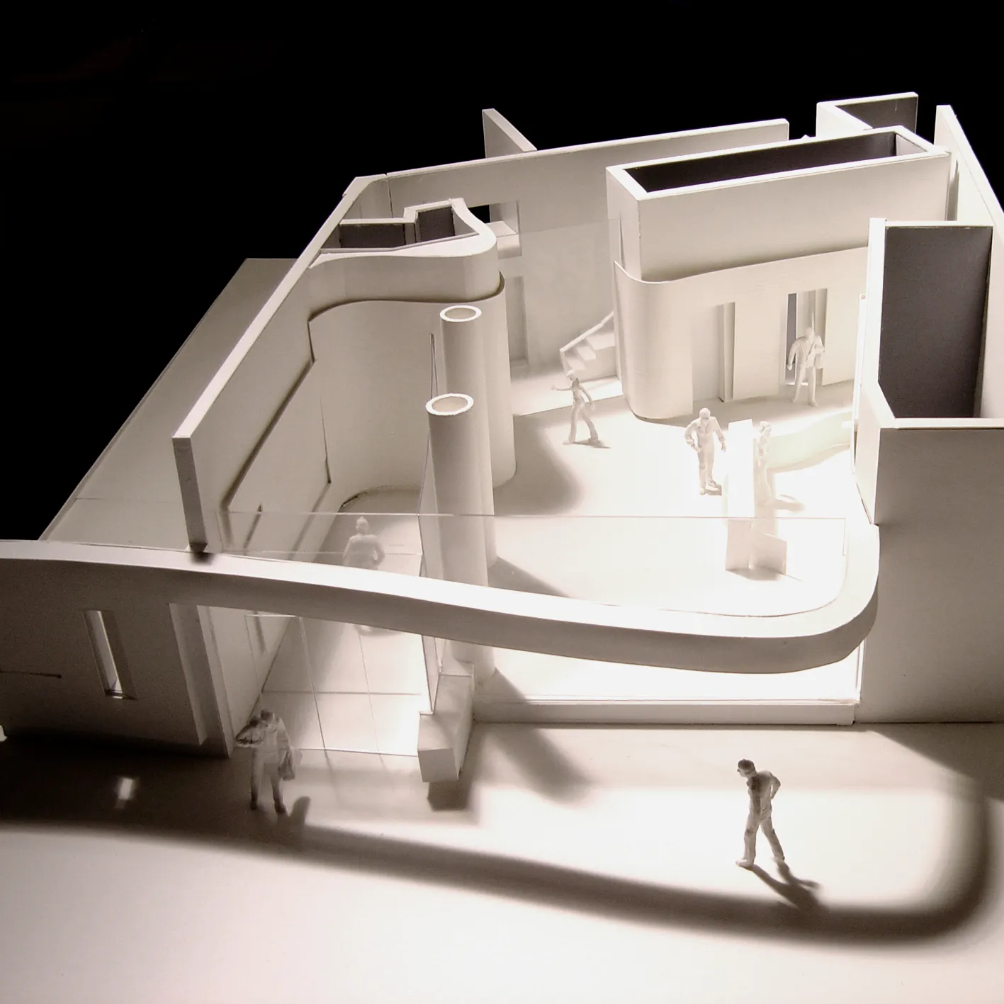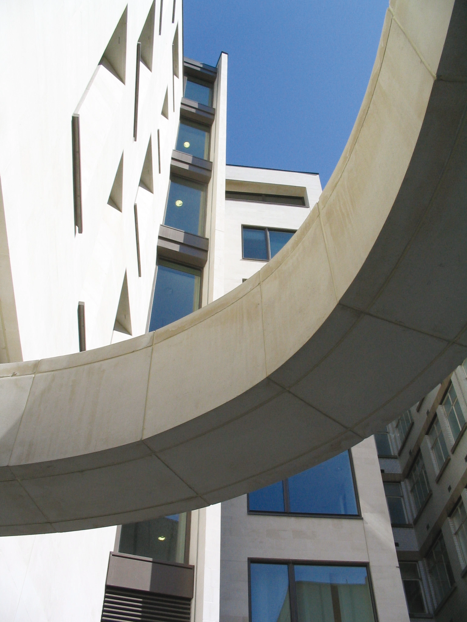 The building addresses environmental issues with rainwater harvesting, CHPs, photovoltaic panels, a concrete frame for high thermal mass and recessed windows to enhance shading.